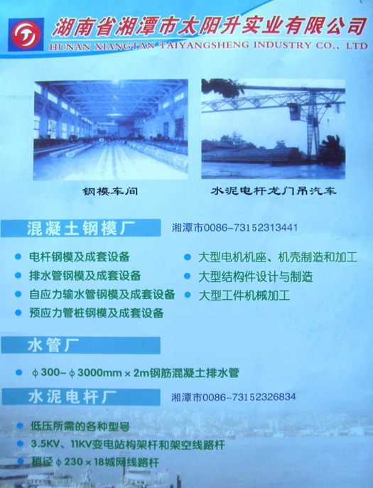 1、鋼模制造廠: ①電桿鋼模及成套設備和技術服務; ②給排水管鋼模及成套設備和技術服務; ③預應力管樁鋼模及成套設備和技術服務; ④預應力高強絲生產(chǎn)成套設備和技術服務; ⑤大型結構件設計與制造。 2、預應力水泥電桿廠: 高、低壓線路桿和構架桿,錐型;等徑 、系列配件。 3、排水管廠: 生產(chǎn)Φ200~Φ400×2m平口、企口、承插、頂管等系列產(chǎn)品,為鐵路、公路、排污、引水、市政、房建等工程配套使用。